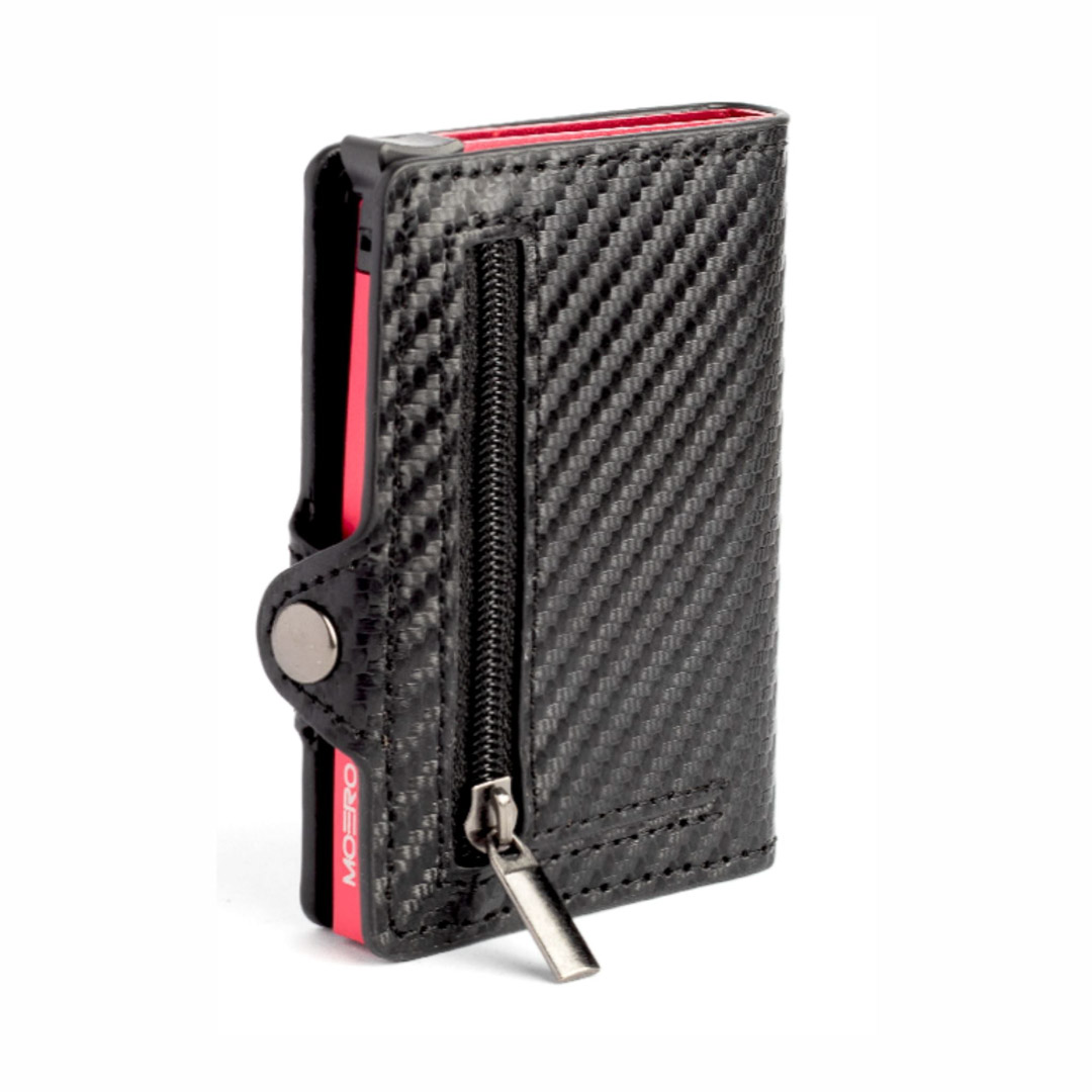 ATTENZIONE: il portacarte Moero Carbon Racing Red Zip può contenere fino a 7 carte lisce, se le carte hanno spessore maggiore ne contiene massimo 4/5